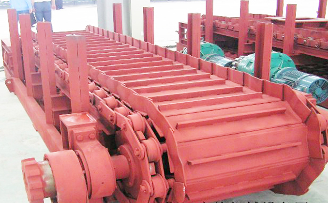 The working process is divided into two parts: firstly, the dynamic is produced by motor and transited to connecting rod and ratchet wheel by reducer. Secondly, the dynamic prompts the connecting rod of eccentric device to reciprocate. The dynamic also prompts pawl and ratchet wheel to make driving sprocket rotate so that link plate intermittently moves. As a result, minerals are conveyed.